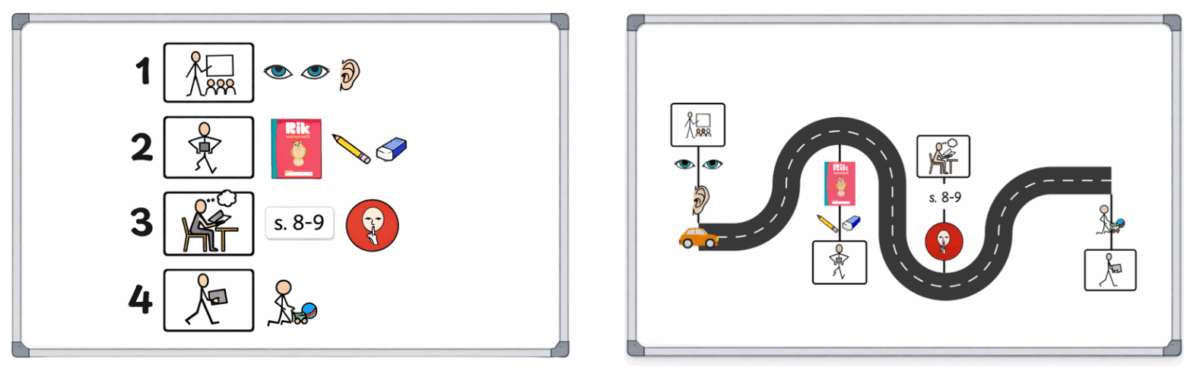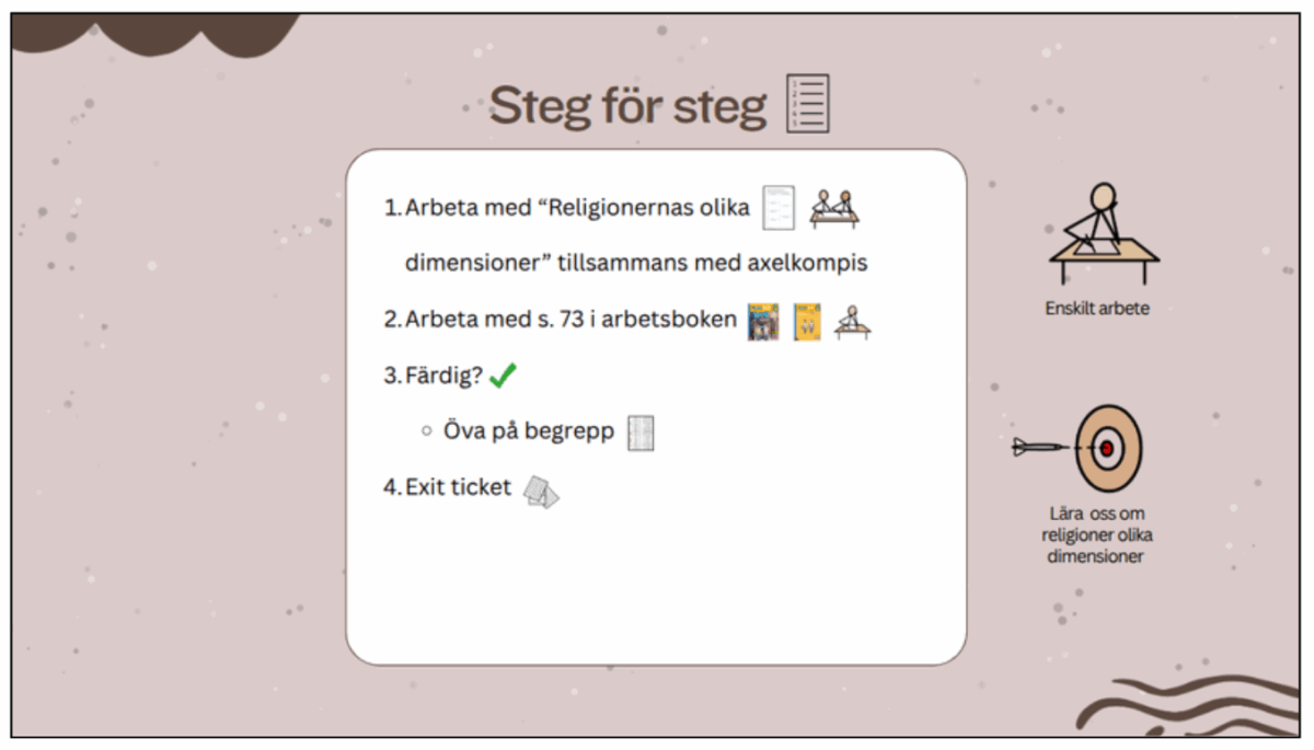 Denna struktur gör att eleverna hela tiden kan orientera sig i lektionen utan att behöva läsa. Bilderna räcker för att skapa trygghet och förståelse.