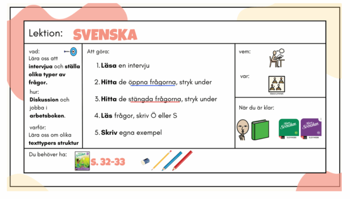 Lektionen inleds med “Lyssna och titta”, där fokus ligger på gemensam genomgång. Därefter följer “Ta fram”, som tydliggör vilket material som ska användas och hjälper eleverna att komma igång på ett lugnt sätt. I det tredje steget “Jobba” blir det tydligt vad uppgiften är och vad eleven ska göra. Lektionen avslutas med “Klar”, som visar vad som förväntas när arbetet är färdigt och vad som händer sedan.