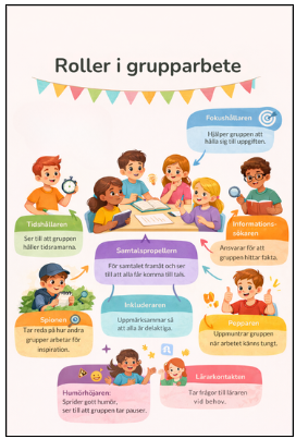 Det kan också vara hjälpsamt att visualisera rollerna med kort eller affischer, så att det blir konkret vem som gör vad. En viktig aspekt är att rollerna inte ska bli etiketter. De är tillfälliga uppdrag, inte beskrivningar av elevernas personlighet.