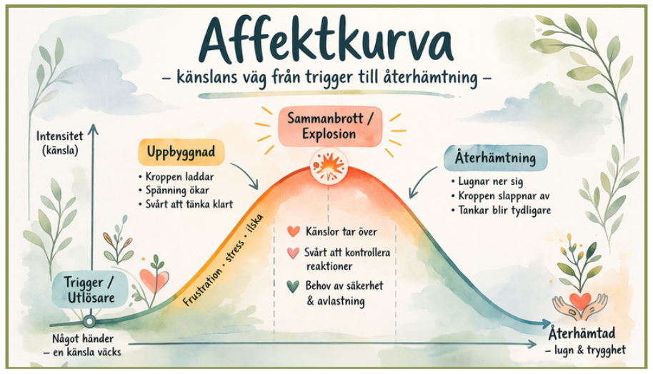 Affekt uppstår sällan plötsligt. Den byggs upp över tid. Affektkurvan hjälper oss att förstå hur ett känslotillstånd utvecklas från ett lugnt läge, genom uppbyggnad, till ett starkt affektpåslag och vidare mot återhämtning.