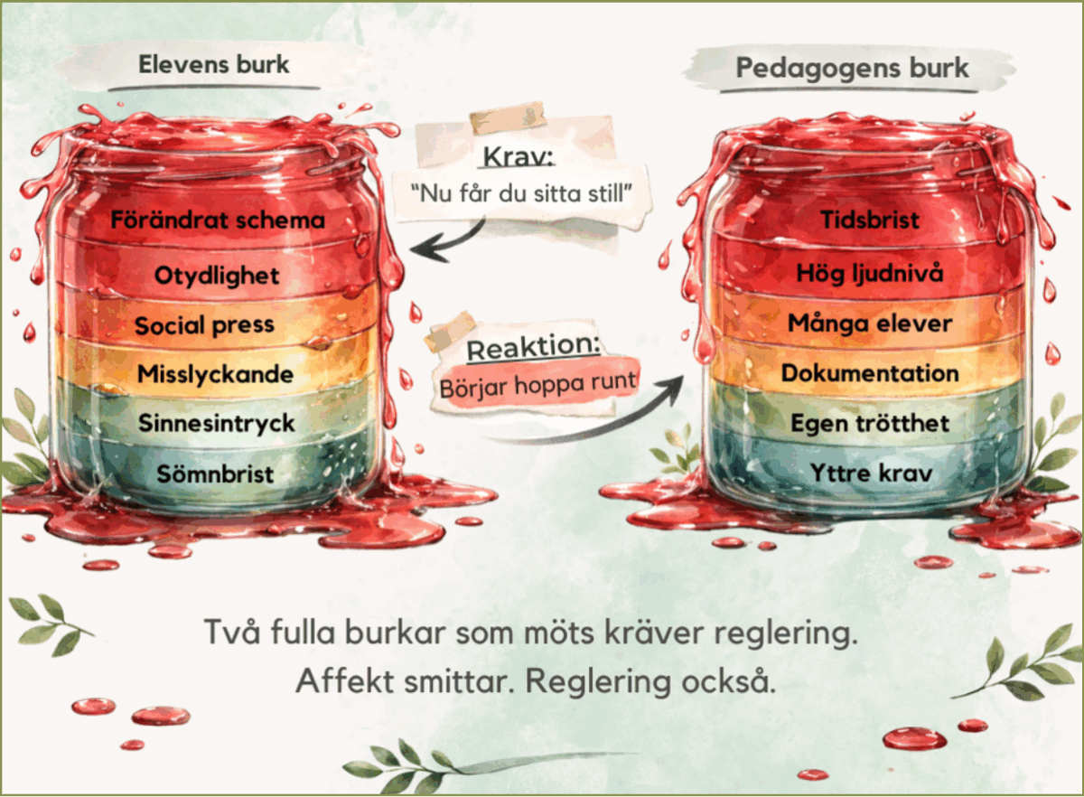Samtidigt behöver vi rikta blicken mot oss själva. Vi pedagoger har också en egen “stressburk” och elevens affekt påverkar oss, även när vi vill vara lugna. Tidsbrist, höga krav, många intryck och komplexa situationer fyller också vår burk under en skoldag. Det gör att vårt eget tillstånd blir avgörande, eftersom en full burk hos oss minskar vår förmåga att behålla lugnet, tänka flexibelt och möta eleven med det förhållningssätt som situationen kräver.