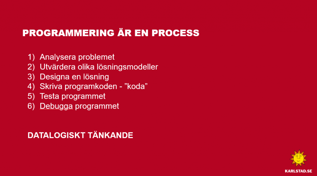 Programmering är så mycket mer än att ”knacka kod”. Genom att arbeta med programmering som ett pedagogiskt verktyg arbetar vi med flera olika förmågor, bl.a. problemlösning, abstrakt logiskt och analytiskt tänkande, felsökning, finna mönster och generaliseringar. Programmering är en process i flera steg – det datalogiska tänkandet. Många av oss tränar förmodligen våra elever i liknande processer när det gäller problemlösning, fast vi inte tänker på att det är samma process i programmering. När vi övar datalogiskt tänkande förtydligar vi den här processen och göra den mer synlig, vi tränar och använder den i fler sammanhang.