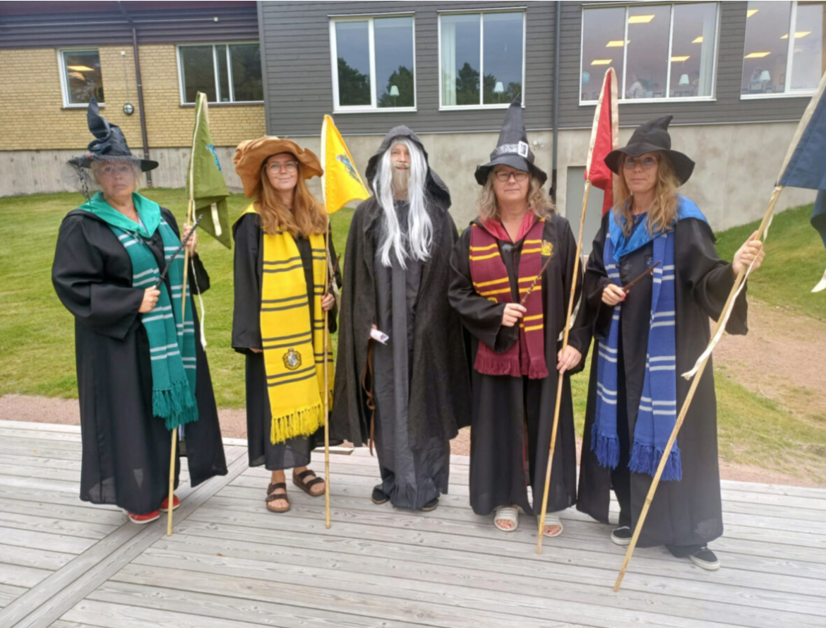Jo på Skattkärrsskolan där vi lever i vår egen fantasivärld, Hogwarts i åk 5. Nära 80 elever har tillbringat tiden här sedan skolstart. Vi har temaarbete. Det är nästan som man glömmer bort sig ibland och tror att man går här. Eleverna pratar Harry Potter och Hogwarts, analyserar utmaningarna, händelser i böckerna och tror på magin med sorteringshatten. De har litteratursamtal vid lunchen i matsalen, helt spontant. Vi är i slutet av vårt temaarbete och ska ha den avslutande ceremonin efter läslovet. Den som berättar vilket elevhem som vunnit pokalen. Alla elever är indelad i ett elevhem: Gryffindor, Hufflepuff. Ravenclaw och Slytherin precis som på ”riktiga” Hogwarts. Alla hoppas på sitt elevhem, de har kämpat, tillsammans.